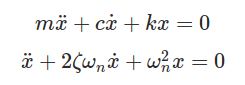 c is the damping present in the system and ζ is the damping factor of the system which is nothing but ratio of damping c and critical damping cc. Critical damping can be seen as the damping just sufficient to avoid oscillations. At critical condition ζ=1. For real systems the value of ζ is less than 1. For system where ζ < 1 the differential equation solution is a pair of complex conjugates. The displacement solution is given by